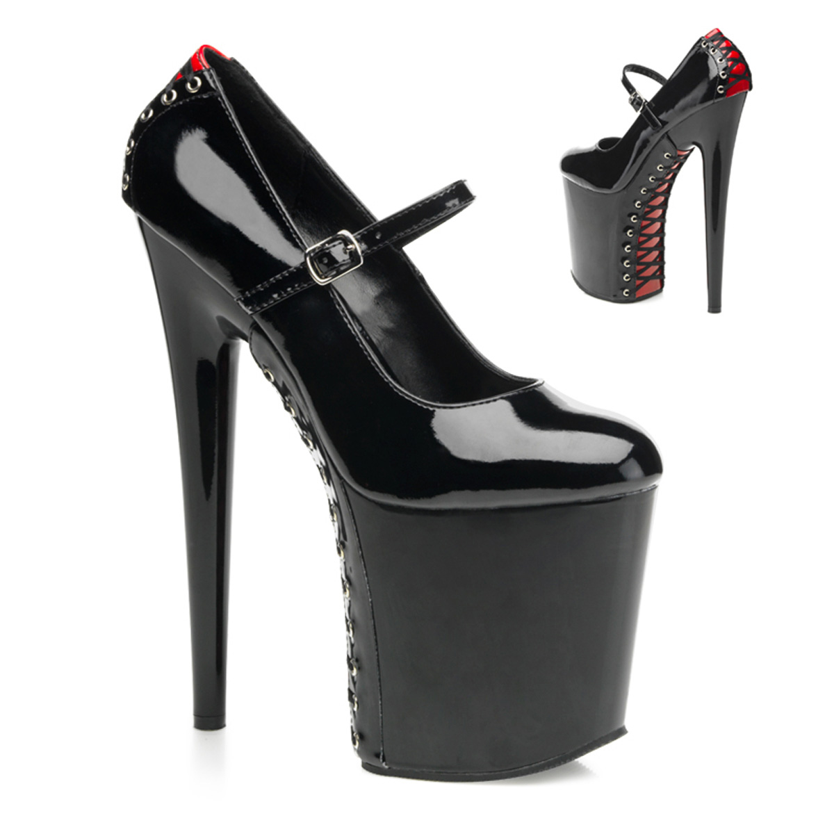 Tyto boty z modelové řady Flamingo mají velmi vysoké 20 cm jehlové podpatky, která jsou ve spodní části kulaté. Boty mají extrémně vysokou 10 cm platformu. Špička této boty je kulatá.