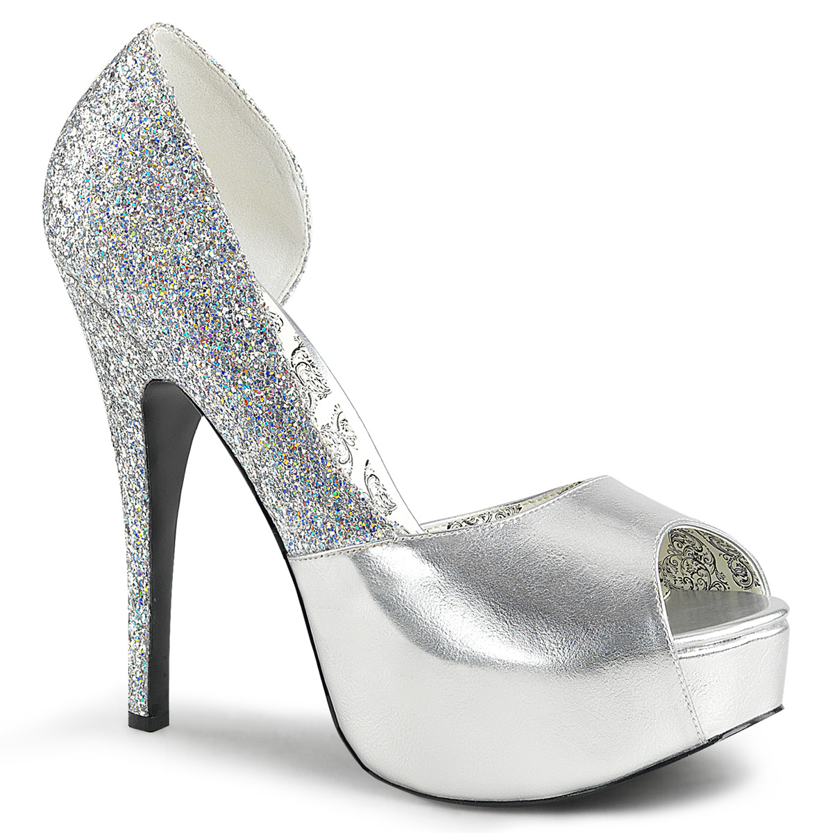 Stříbrné lodičky s otevřenou špičkou na platformě s vysokými podpatky